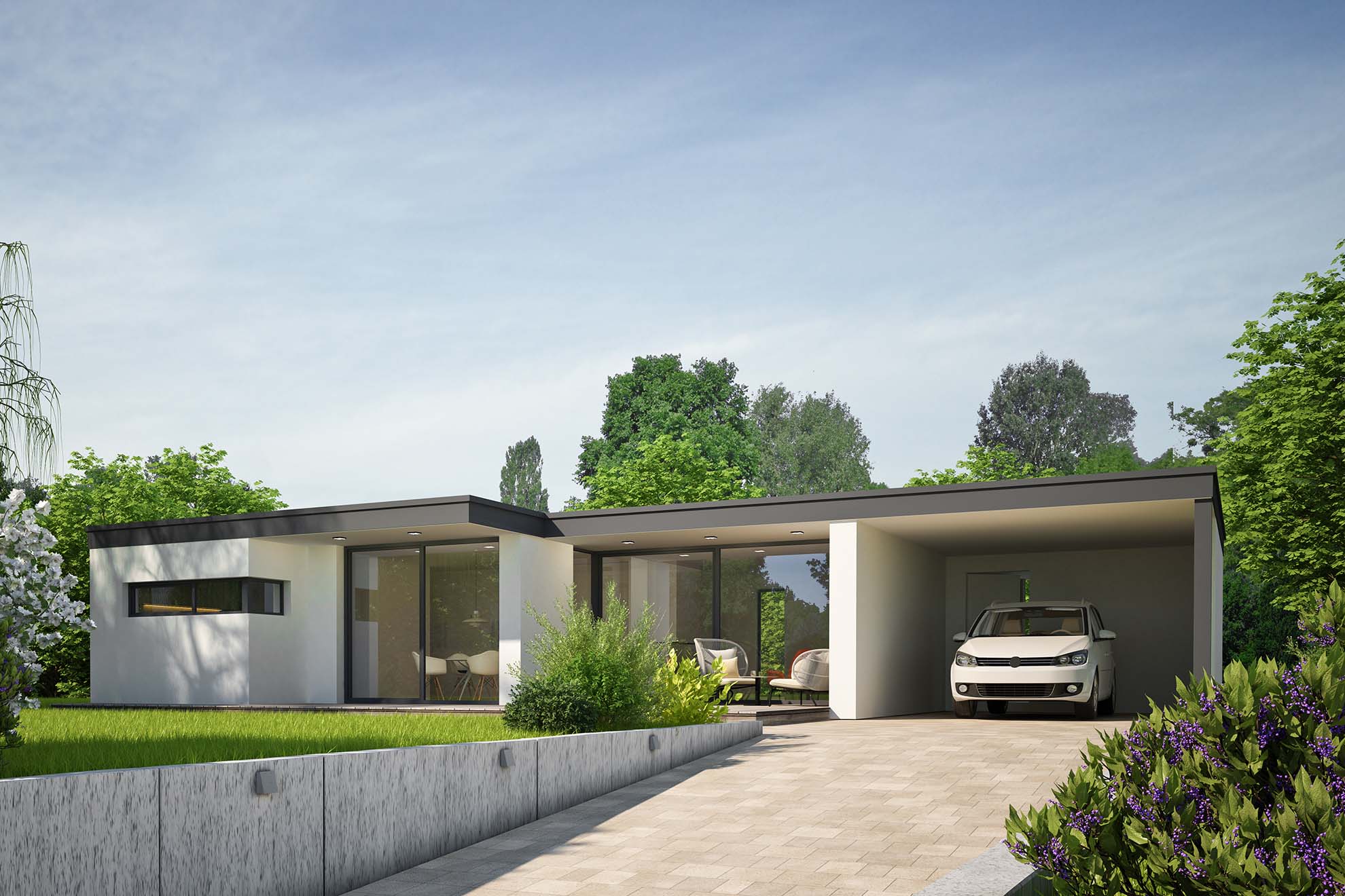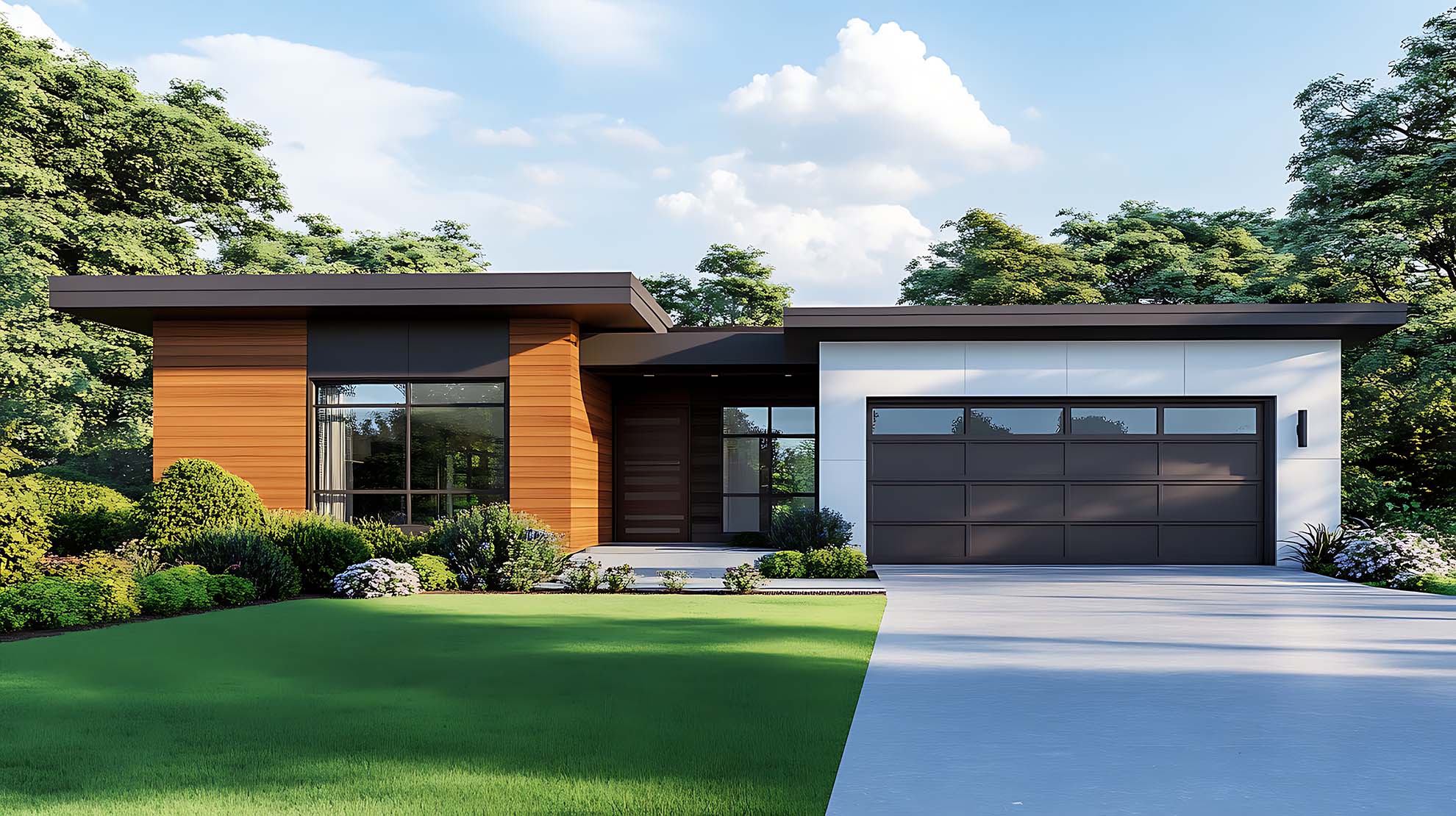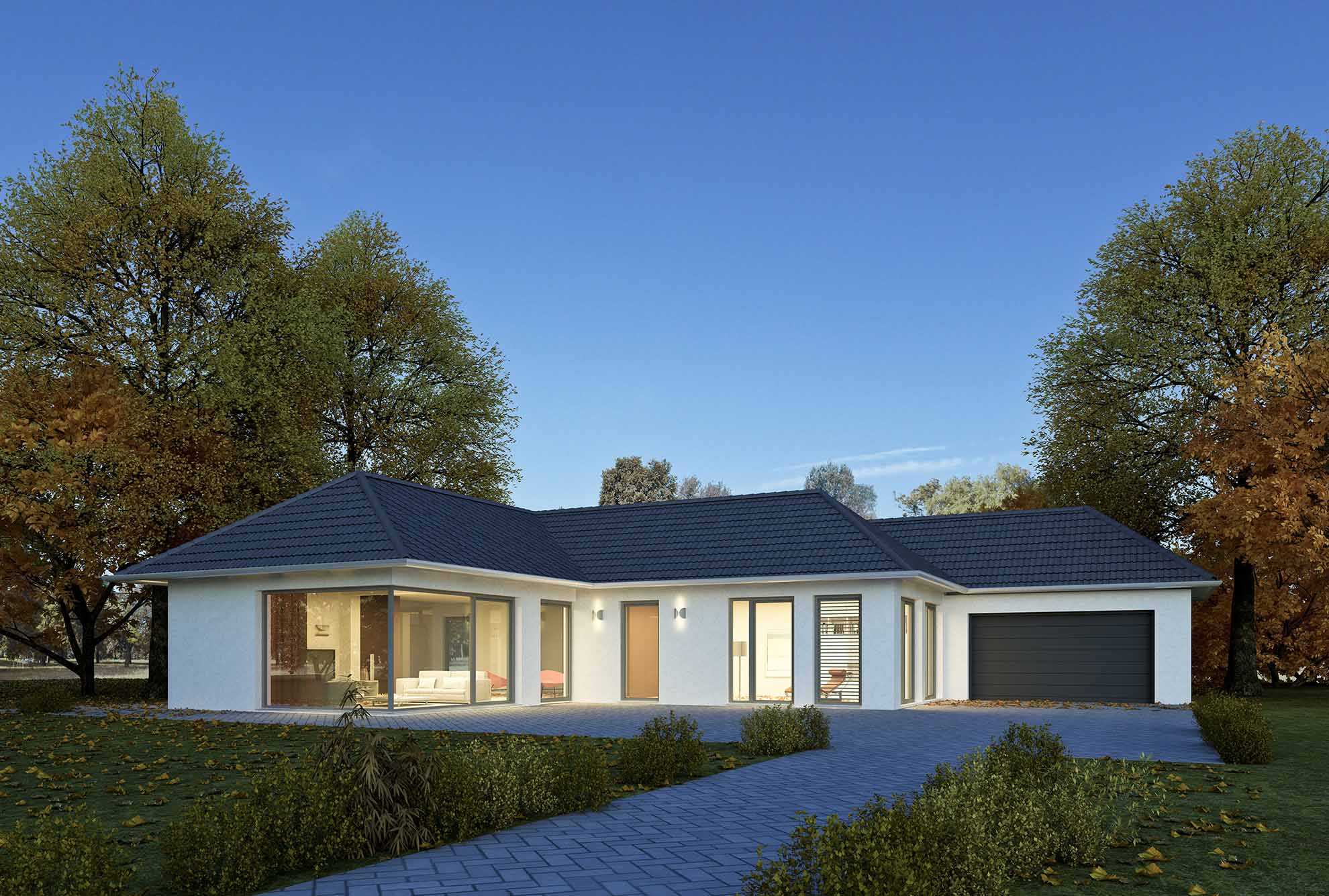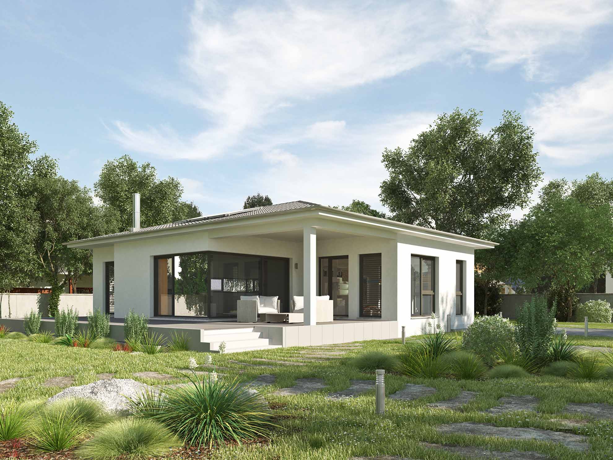 • Moderne Bungalows: Klare Linien, große Fenster und offene Grundrisse prägen diese Designs.